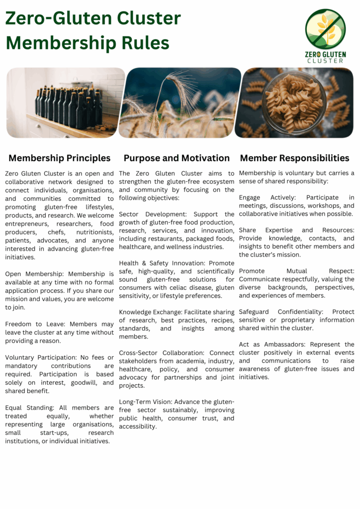 Zero Gluten Cluster was established as a pan-European initiative in response to the growing need for a coordinated, cross-border effort to develop the gluten-free sector, with a focus on sustainable health, dietary inclusion, and food innovation across multiple sectors.